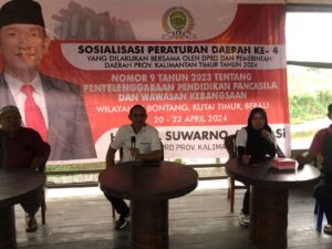 Kutai Timur, kabarhaluan.com – Dalam rangka meningkatkan pengetahuan masyarakat Kabupaten Kutai Timur (Kutim), khususnya di wilayah Kecamatan Sangatta Utara, kembali Anggota Dewan Perwakilan Rakyat Daerah (DPRD) Provinsi Kalimantan Timur (Kaltim) Agiel Suwarno, gencar melaksanakan kegiatan Sosialisasi Peraturan Daerah (Sosperda) Nomor 9 Tahun 2023, tentang Penyelenggaraan Pendidikan Pancasila dan Wawasan Kebangsaan, berlokasi di Jalan Pinang Dalam RT 22 Kecamatan Sangatta Utara, Senin (22/4/2024).